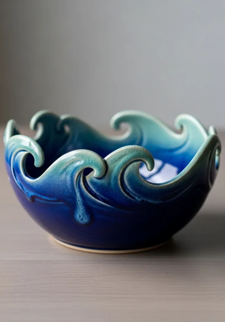 This sculpted ceramic bowl features dramatic, curling edges that resemble rolling ocean waves. Layers of deep navy, bright turquoise, and soft seafoam glaze flow together with a glossy finish that catches the light beautifully. The rim rises and dips in organic curves, giving the piece movement and personality. Subtle variations in the glaze create depth, making it feel truly handmade and one of a kind.