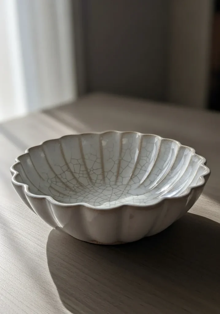 This elegant ceramic bowl features a softly scalloped rim that forms gentle waves all the way around. The creamy off white glaze has a subtle sheen that highlights the delicate ridges and fine vertical lines inside the bowl. The overall shape feels timeless and slightly vintage, like something passed down through generations. Its clean finish and graceful silhouette give it that unmistakable handcrafted look.
