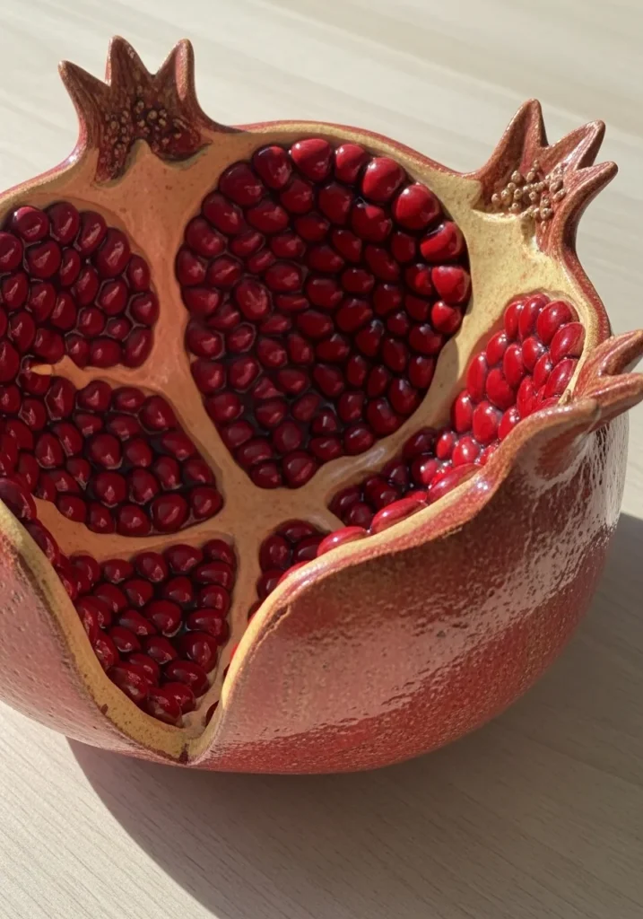 This bold ceramic bowl is designed to resemble a split open pomegranate, revealing glossy red seeds inside. The exterior has a soft blush pink glaze with subtle texture, while the interior bursts with deep ruby tones. Raised seed shapes create a playful three dimensional effect, making the bowl feel both artistic and tactile. The glossy finish enhances the richness of the colors and highlights every sculpted detail.