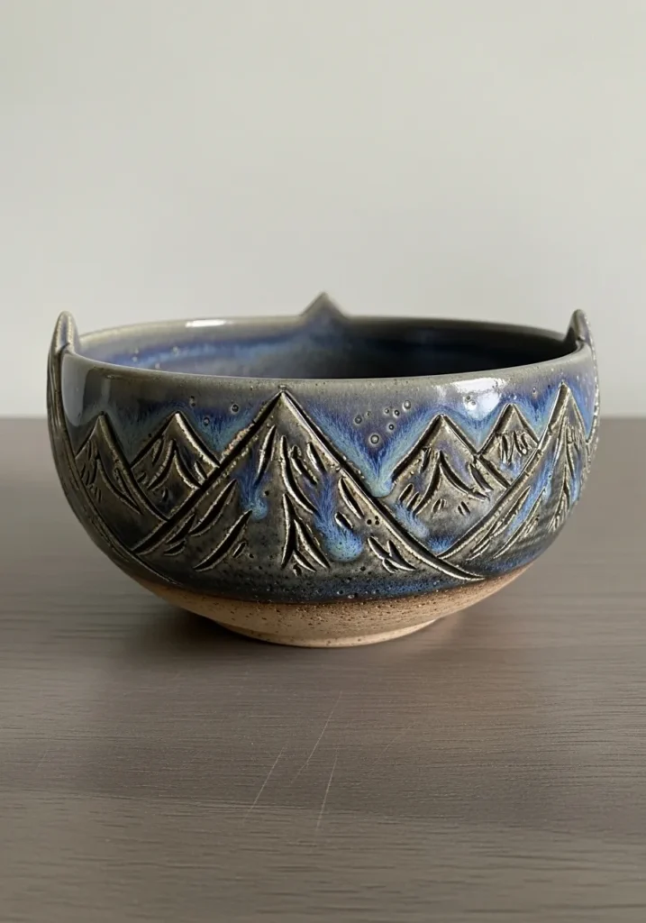This striking ceramic bowl features a carved mountain range wrapping around the exterior. The glaze blends deep midnight blue with earthy brown tones, giving the peaks depth and contrast. The textured relief design adds dimension, while the interior remains smooth and dark for a sleek finish. Subtle glaze variations settle into the carved lines, enhancing the handcrafted feel.