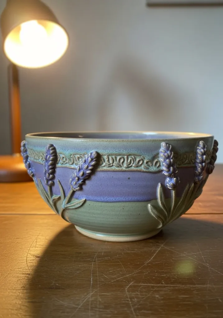 This charming ceramic bowl showcases raised lavender sprigs wrapping around the exterior. Soft lilac and muted green glazes highlight the delicate floral details against a pale sage base. The slightly matte surface gives it a cozy, countryside vibe, while the smooth interior keeps it practical for everyday use. The sculpted stems and blossoms add depth and texture that feel thoughtfully handcrafted.
