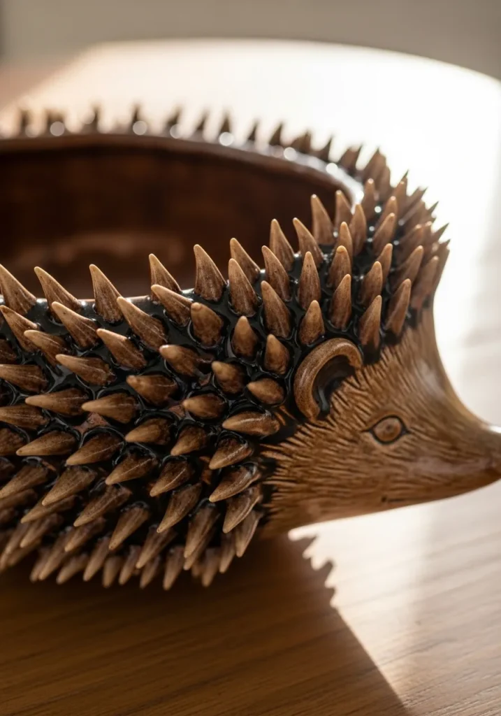 This whimsical ceramic bowl is shaped like a hedgehog curled into a gentle curve, with textured spikes covering the back. Warm brown and caramel glazes enhance the detailed carving, while the rounded interior remains smooth and functional. The sculpted snout and tiny ears add character without overpowering the design. It feels like a tiny woodland creature turned into a functional piece of art.