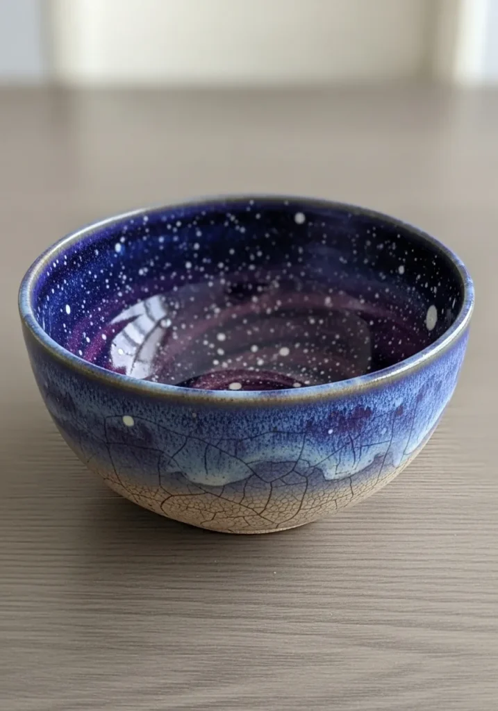 This stunning ceramic bowl features a deep indigo and violet glaze that swirls together like a night sky. Speckles of white and soft pink mimic distant stars, creating a dreamy cosmic effect inside the bowl. The glossy finish enhances the layered glaze, giving it incredible depth and richness. The exterior remains darker and more understated, allowing the interior to truly shine.