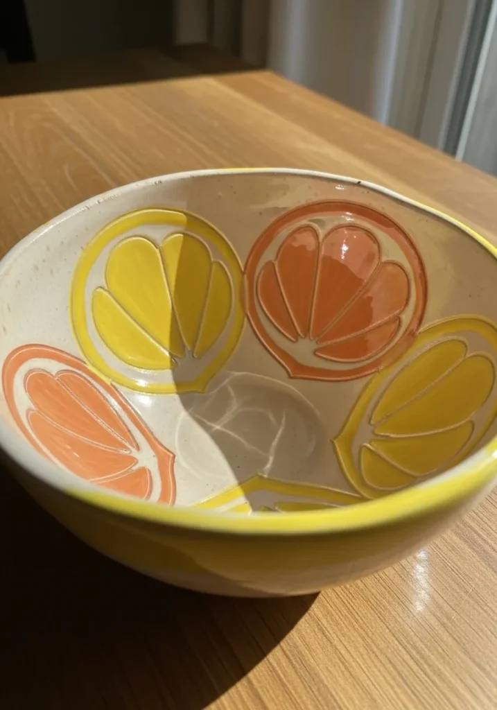 This bright ceramic bowl features hand painted citrus slices in cheerful shades of lemon yellow, grapefruit pink, and orange. The creamy base glaze allows the fresh colors to pop, while the glossy finish adds a juicy shine to each slice. The simple rounded shape keeps it classic, letting the playful fruit pattern take center stage. It feels fresh, summery, and full of energy.