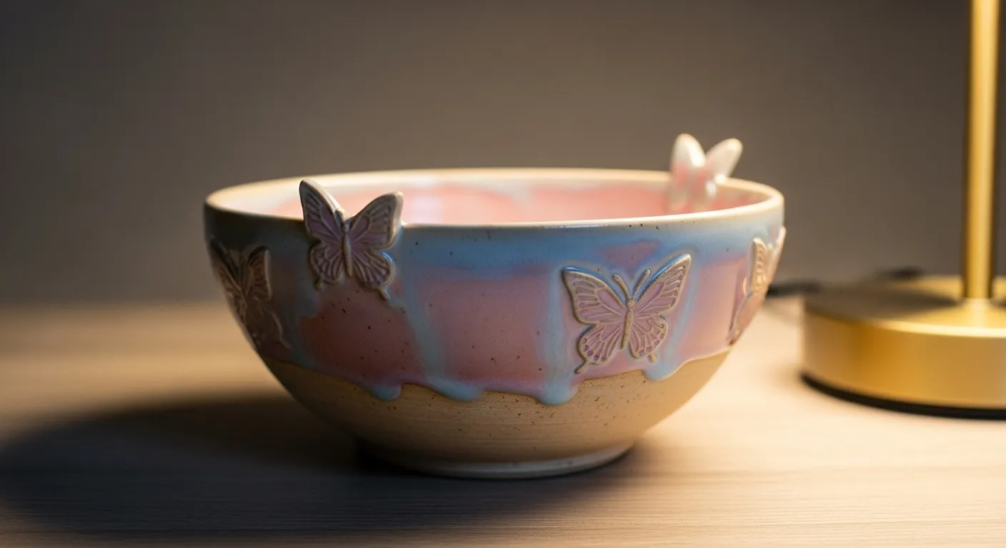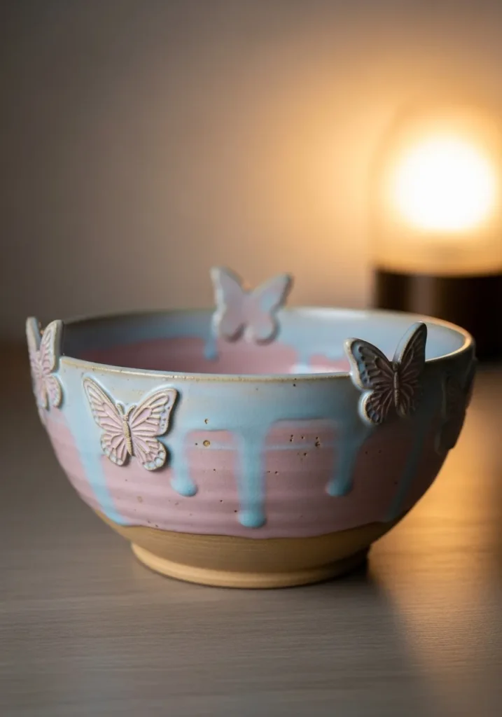 This sweet ceramic bowl features soft pastel tones blending from blush pink to pale blue, finished with a gentle drip glaze effect along the upper edge. Delicate raised butterflies decorate the exterior, adding texture and charm. The glossy glaze enhances the soft color transition, while the sculpted details give it that unmistakable handmade look. The overall design feels light, airy, and whimsical.