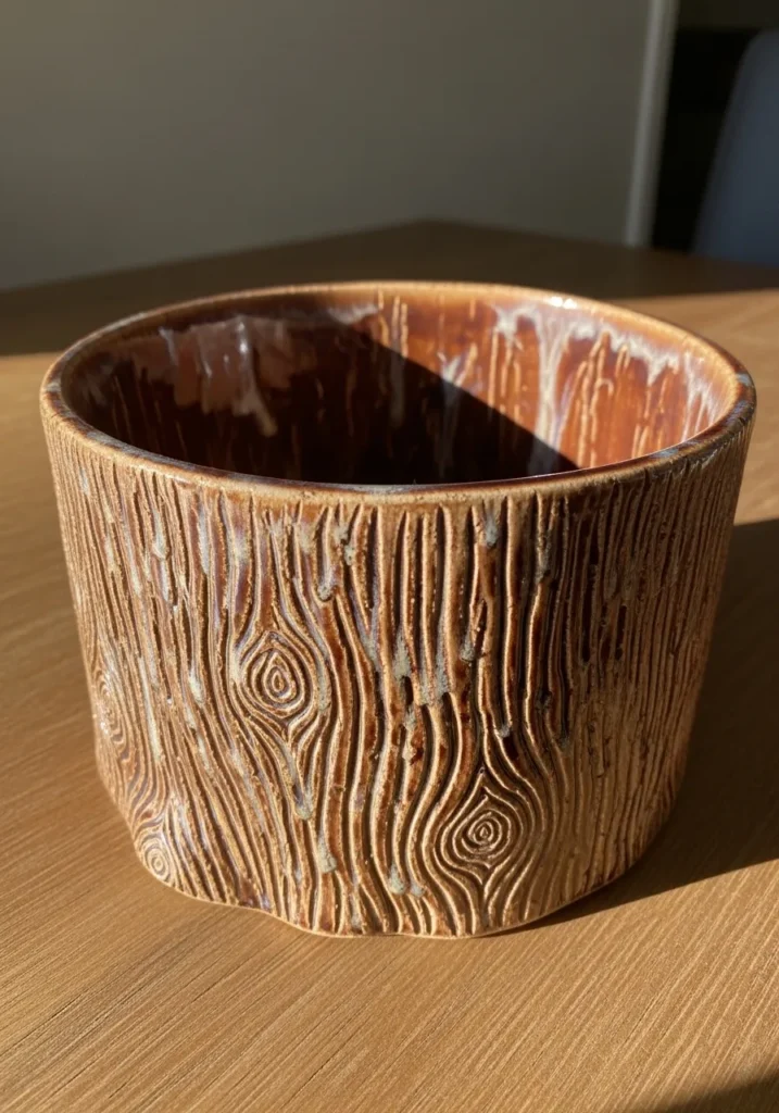This rustic ceramic bowl features a beautifully carved exterior that mimics the look of real tree bark. Fine vertical grooves and organic lines wrap all the way around, giving it rich texture and depth. The outer glaze is a warm wood toned brown with subtle variations, while the interior shines with a glossy amber finish that adds contrast and warmth. The combination of matte texture outside and smooth glaze inside makes it feel earthy and handcrafted in the best way.