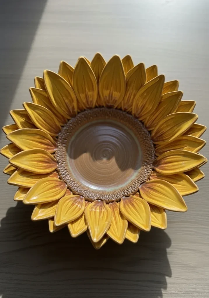 This ceramic bowl is designed to look like a blooming sunflower, with sculpted petals radiating from the center. The rich golden yellow glaze gives each petal warmth and dimension, while the textured center is finished in a soft earthy brown. The layered petals add depth and a lovely handcrafted charm, almost like a ceramic flower frozen in full bloom. The glossy surface enhances the vibrant color and highlights every carefully shaped detail.