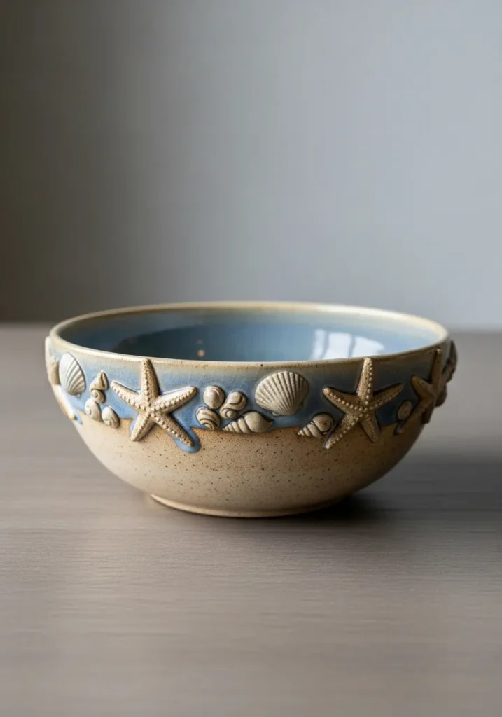 I think seaside themes are always such a joy to create. Pressing small shell shapes into clay or sculpting them by hand feels playful and creative. It is a lovely way to bring a bit of summer into everyday pottery. A bowl like this would be perfect for anyone who loves ocean inspired decor.