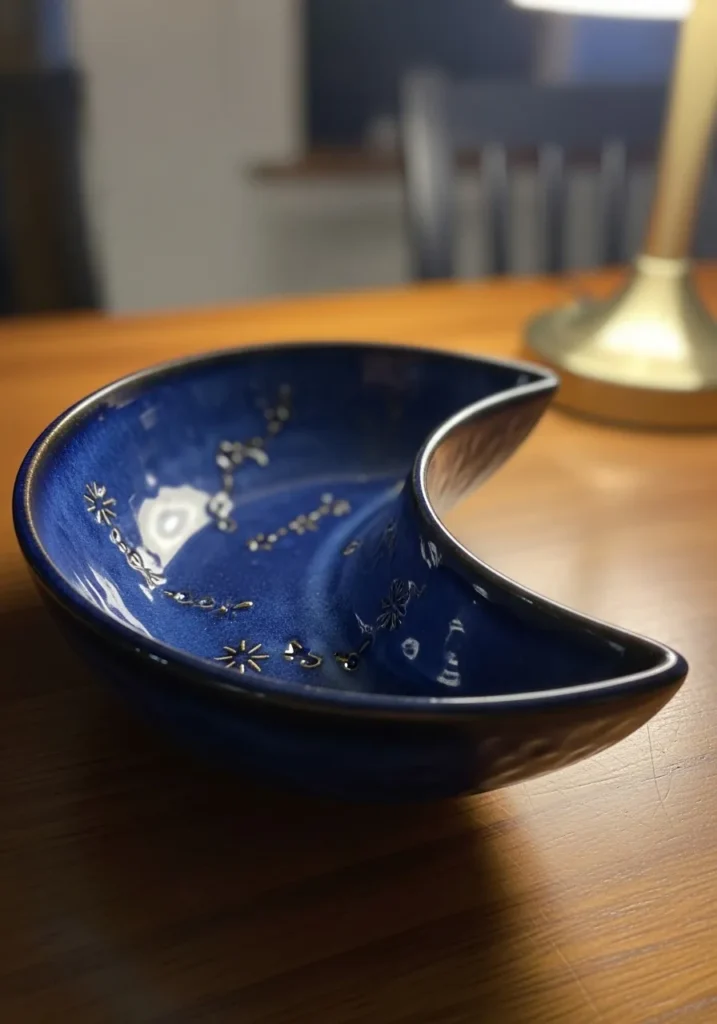 This deep blue ceramic bowl features a graceful crescent shape with one side dipping inward like a soft curve of the moon. The glossy cobalt glaze is accented with delicate speckles that resemble tiny stars scattered across the night sky. Its asymmetrical silhouette adds a modern artistic feel, while the smooth interior keeps it practical and usable. The rich color and subtle detailing make it look carefully crafted by hand.