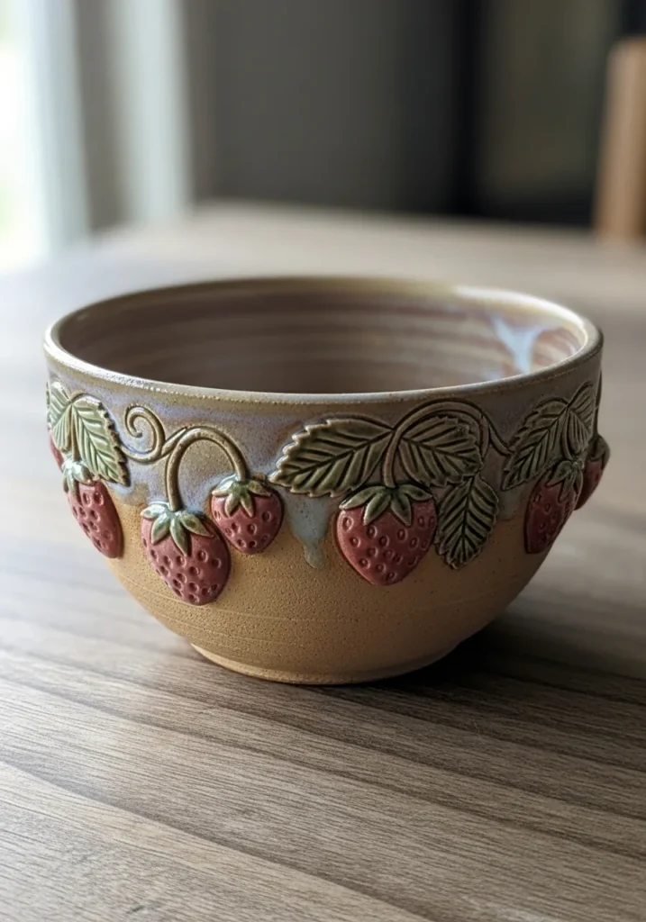 This charming ceramic bowl features a soft cream base adorned with hand painted strawberry vines wrapping around the exterior. The strawberries are glazed in warm reds with leafy green accents, giving the piece a sweet cottage feel. A smooth glossy finish protects the painted details while enhancing the natural clay tones beneath. The rounded shape keeps it timeless, while the decorative pattern adds that handcrafted touch.