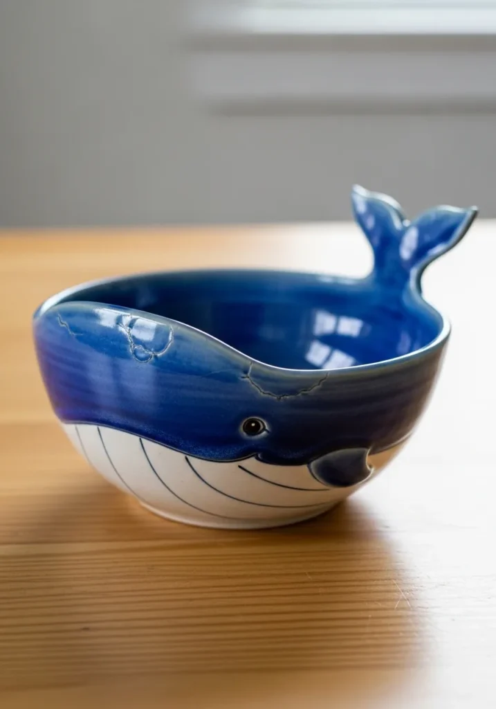 This playful ceramic bowl is shaped like a small blue whale, with the tail gently lifting along the rim. The glaze transitions from deep ocean blue on top to soft white underneath, giving it a clean and polished look. Subtle line details hint at the whale’s features without overwhelming the design. The glossy surface highlights the smooth curves and adds to its handcrafted charm.