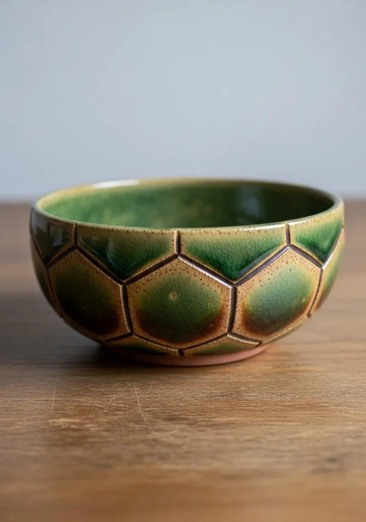 This ceramic bowl showcases a bold honeycomb pattern carved into the exterior. Each hexagon is glazed in rich shades of moss green and deep amber, creating a stained glass effect. The glossy finish enhances the color variations, while the carved lines give the surface depth and structure. The rounded interior contrasts nicely with the textured outside, balancing modern design with handcrafted warmth.