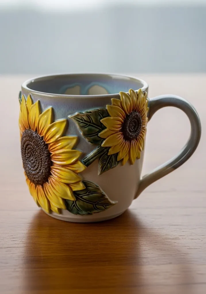 This ceramic mug features a soft neutral base with beautifully raised sunflower designs wrapping around the surface. The petals are detailed and slightly layered, finished in warm golden yellow tones that contrast nicely with the muted background. Deep brown centers and leafy green accents add richness and texture, while the glossy glaze enhances every carved detail. The overall shape stays classic and rounded, letting the floral design stand out as the main focus.