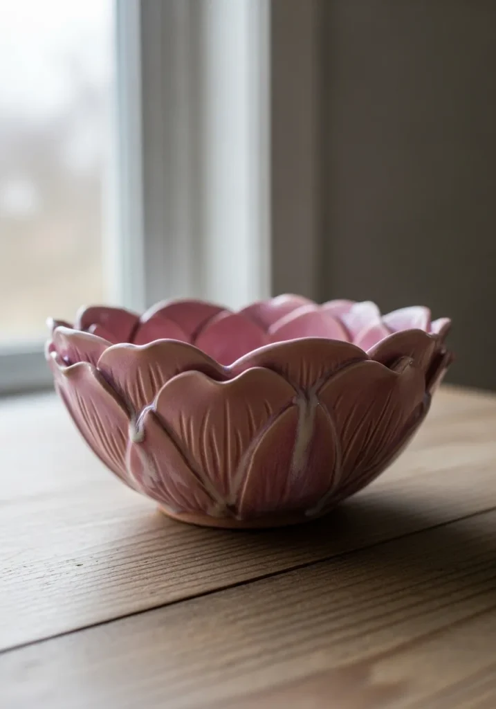 This ceramic bowl is shaped like a soft blooming flower, with layered petals forming the entire structure. Each petal curves gently outward, creating a delicate and organic silhouette. The glaze blends warm rosy pinks with subtle earthy undertones, giving it a slightly rustic yet romantic feel. Fine carved lines add texture to each petal, and the natural glaze variations settle into those grooves, making the details stand out in the prettiest way. The edges are slightly uneven, which adds to that handmade charm and makes the piece feel extra special.