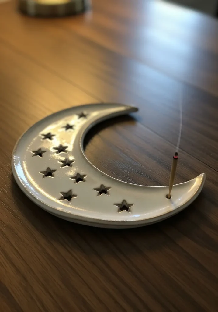 This ceramic incense holder is shaped like a soft crescent moon, giving it a dreamy and calming vibe. The surface is coated in a smooth creamy white glaze with a gentle sheen, while small star cutouts are scattered across the curve for added charm. Each star has slightly imperfect edges, which makes the piece feel handmade and unique. The incense stick sits neatly at one end, allowing the smoke to drift softly along the curve, creating a peaceful and cozy atmosphere.