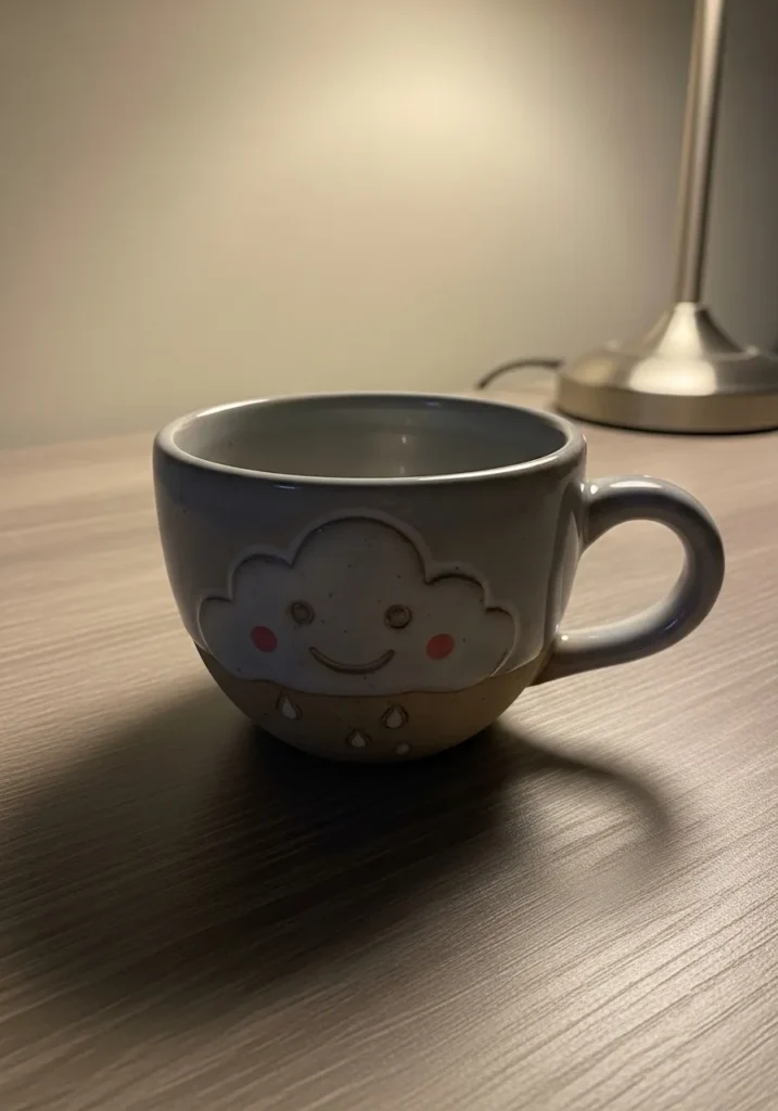 This soft gray mug has a rounded body with a clean, evenly attached handle. A small cloud motif with tiny dot details decorates the side, adding personality without overpowering the design. The glaze is glossy and smooth, reflecting light beautifully. The proportions feel sturdy and practical for daily use.