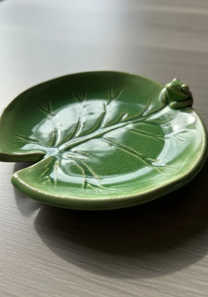 This green plate is thrown flat and then shaped slightly to mimic a natural leaf curve. Subtle vein lines are carved into the surface, and the glossy glaze settles into the grooves for depth. The rim is gently raised, keeping the form structured and functional. It feels organic but controlled.