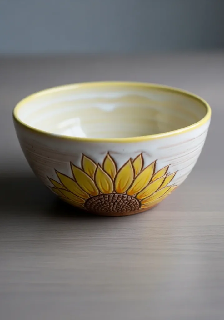 This creamy bowl features a smooth rounded body with a bright sunflower design painted along the outer wall. The throwing lines remain faintly visible under the glaze, showing its handmade character. The interior glaze is glossy and even, creating a lovely contrast with the decorative exterior. It feels cheerful yet balanced.
