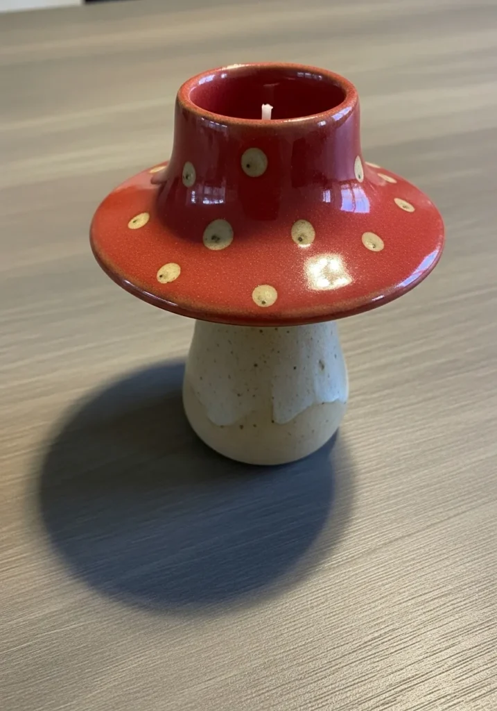 This playful piece is thrown in two sections with a rounded stem base and a flared red cap on top. The glossy glaze highlights the smooth curves and evenly pulled walls. Small dot details on the cap add texture and charm. The proportions show careful control and thoughtful shaping.