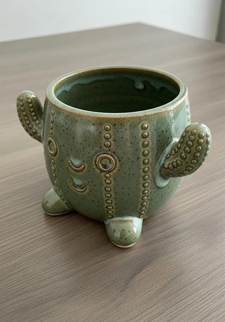 This rounded planter is thrown as a classic cylinder and finished with small cactus like protrusions attached around the sides. The glaze is a muted sage green with tiny dotted details that add texture and charm. The foot is trimmed neatly, which gives the piece stability and a clean finish. The overall look is playful but still rooted in solid wheel technique.