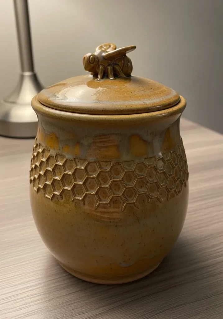 This warm golden jar has a rounded body with a honeycomb pattern impressed into the surface. The lid fits snugly on top and features a small sculpted accent for easy lifting. The glaze pools in the textured cells, creating dimension and shine. The foot is neatly trimmed, giving the piece a stable base.
