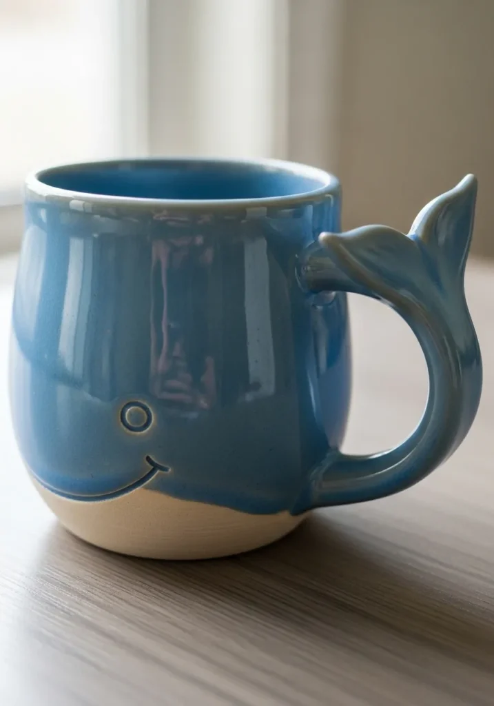 This cheerful blue mug has a smooth cylindrical body with a sculpted whale shaped handle that curves naturally into the side. The glaze transitions from deep blue at the top to a lighter tone near the base. A small smiling detail near the bottom adds charm without crowding the design. The proportions feel sturdy and comfortable to hold.