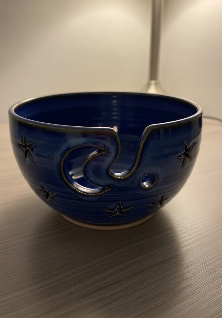 This glossy cobalt bowl has a smooth round body with subtle carved star details along the outer surface. The rim curves inward slightly, making it cozy and practical for soups or snacks. The glaze is rich and reflective, pooling beautifully in the carved lines. It feels classic with a touch of whimsy.