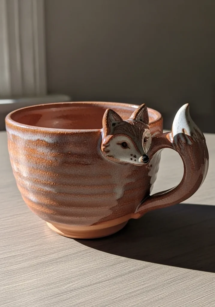 This warm terracotta mug features a classic cylindrical body with soft horizontal throwing lines still visible beneath the glaze. The handle is sculpted into a fox shape that wraps along the side, adding character without overwhelming the design. The glaze blends earthy tones with a glossy finish inside. The proportions feel balanced and sturdy.
