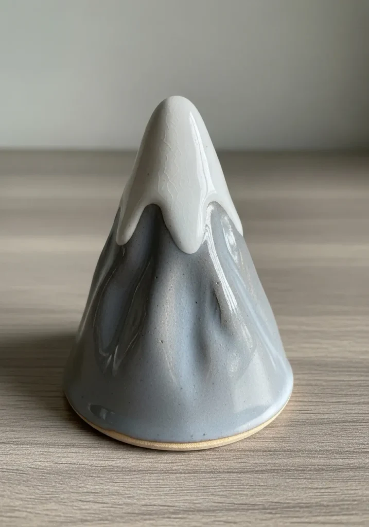 This tall wheel thrown piece is shaped like a soft mountain peak with a glossy white top that drips gently into a muted gray base. The silhouette narrows toward the tip, showing careful pulling and steady control on the wheel. The glaze transition adds visual interest while the structure remains simple and centered. It feels clean and sculptural without being complicated.