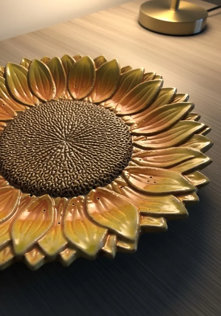 This bold plate is shaped and textured like a blooming sunflower, with layered petals radiating from a detailed center. The glaze blends warm golden tones with deeper earthy shades, highlighting the sculpted texture. It feels decorative while still being functional.