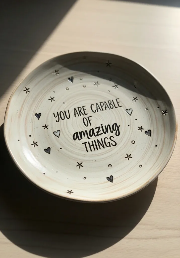 This simple plate features a soft neutral glaze with a hand lettered message at the center, surrounded by tiny star details. The lettering feels personal and slightly imperfect, which adds to the charm. The overall design stays clean and uplifting.