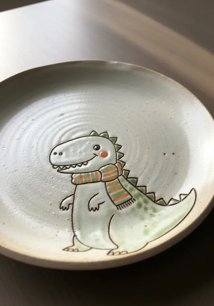 This plate showcases a sweet dinosaur illustration with soft colors and playful details. The background stays minimal, letting the character stand out without feeling busy. The gentle brushwork keeps the look friendly and handmade.