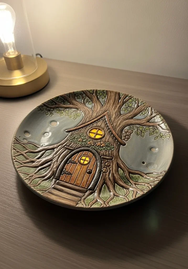 This charming plate shows a hand illustrated tree with a tiny door and glowing windows nestled inside. Earthy browns and greens give it a warm fairytale feel. The details feel thoughtful without overwhelming the design.