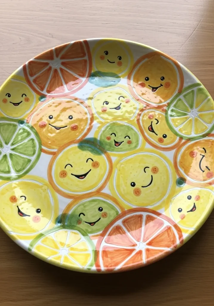 This cheerful plate is covered in hand painted citrus slices with happy expressions. Bright yellows, oranges, and greens create an energetic but balanced look. The repeating pattern keeps the design playful and cohesive.