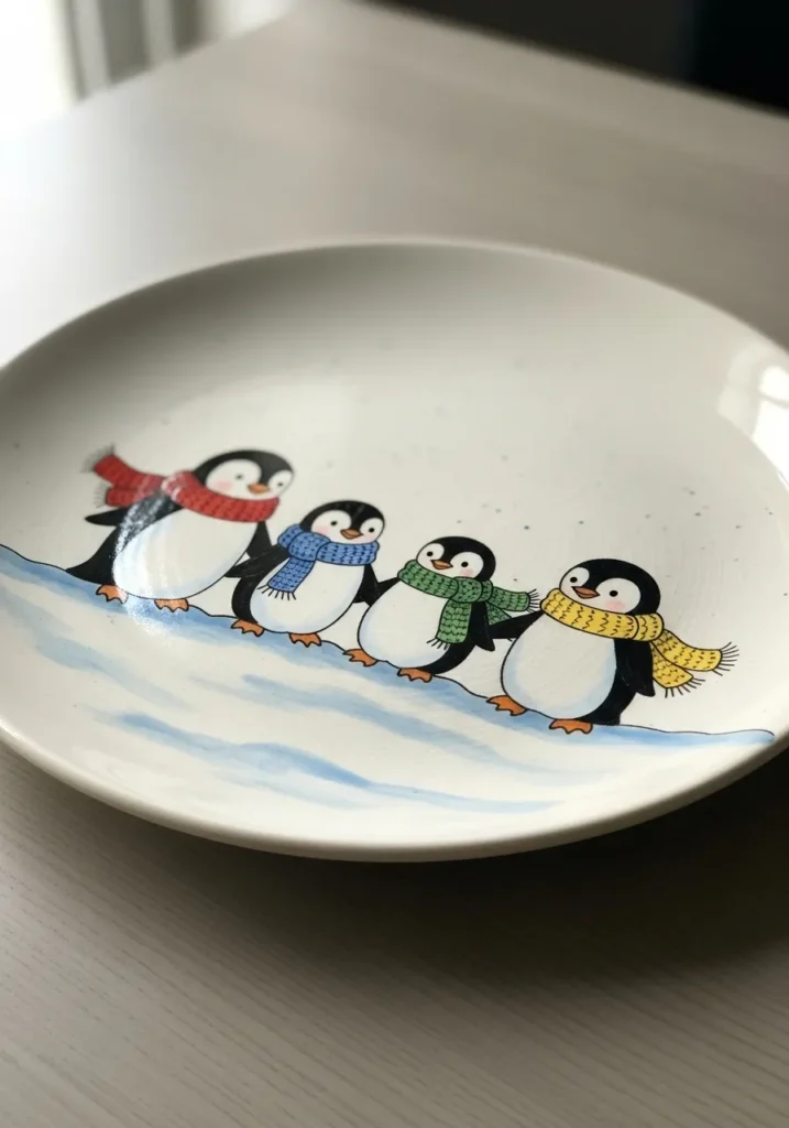 This sweet plate features a row of illustrated penguins standing together against a soft background. The simple color palette keeps it clean, while the tiny details add warmth and charm. The composition feels balanced and lighthearted.