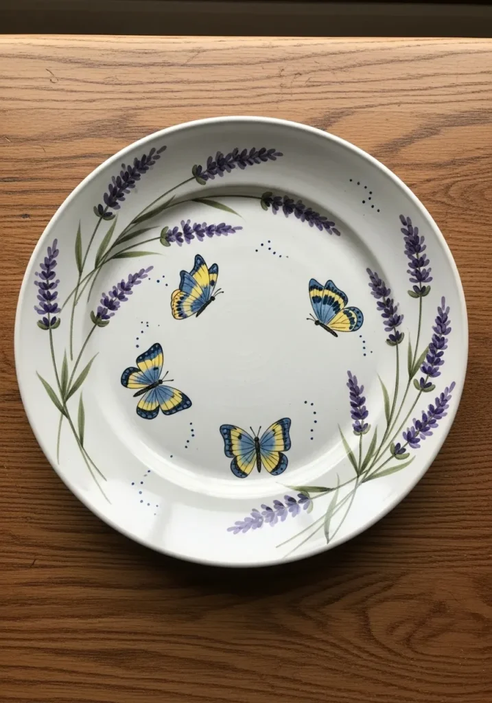This ceramic plate features delicate lavender sprigs and soft blue butterflies hand painted across a clean white surface. The colors feel gentle and balanced, with fine brushstrokes that give the design a light and airy look. The rim stays simple, letting the floral details feel calm and intentional.