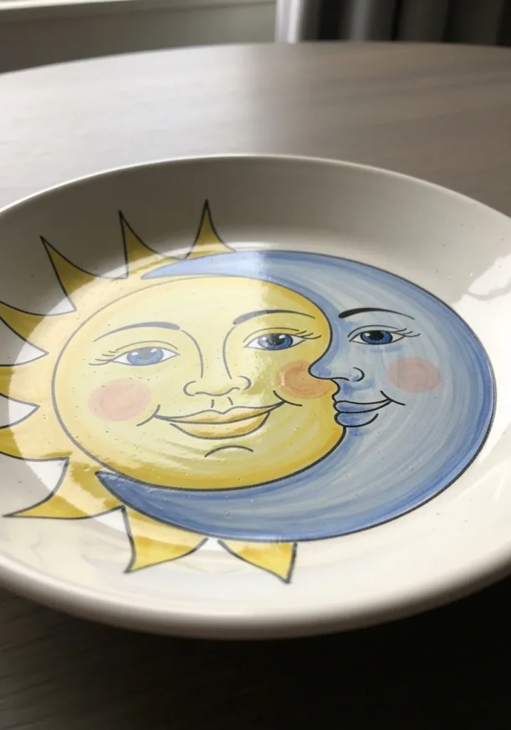 This charming plate showcases a whimsical sun and moon face design, painted in warm yellows and soft blues. The expressions feel dreamy and gentle, with subtle shading that adds depth without overpowering the plate. The smooth glaze brings everything together with a polished finish.