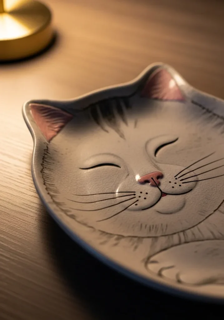 This charming plate is shaped with subtle ear details and features a softly illustrated cat face at the center. The glaze is warm and neutral, while the simple line work gives it a sweet and friendly expression. The overall design feels playful but still polished enough for everyday use.