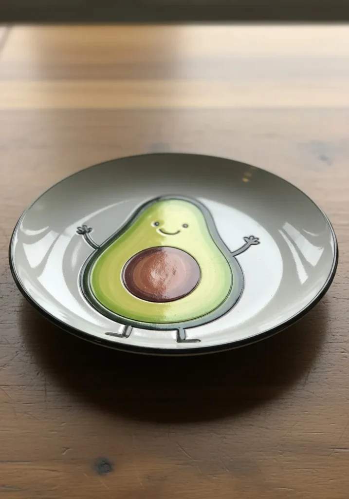 This modern plate features a playful avocado illustration centered on a smooth neutral background. The soft green tones and simple lines keep it clean and graphic. The slightly raised rim gives it a finished and thoughtful look.