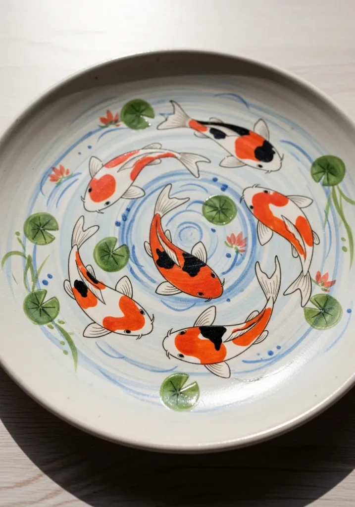This plate features koi fish swimming in a gentle circular pattern, painted in soft orange, black, and white tones. The movement of the fish creates a calming flow across the surface. The white background keeps the design feeling light and balanced.