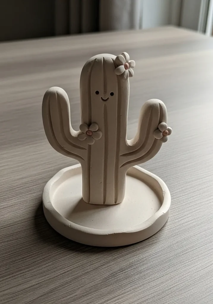 This sweet little cactus ring holder is shaped from air dry clay and placed on a small round base for stability. The design is simple and clean, with softly carved cactus lines and rounded arms that give it a playful feel. The natural beige clay color keeps it minimal and modern, while the matte texture highlights the handmade finish. It feels sturdy yet delicate, making it perfect for holding rings or tiny jewelry pieces on a nightstand or vanity.