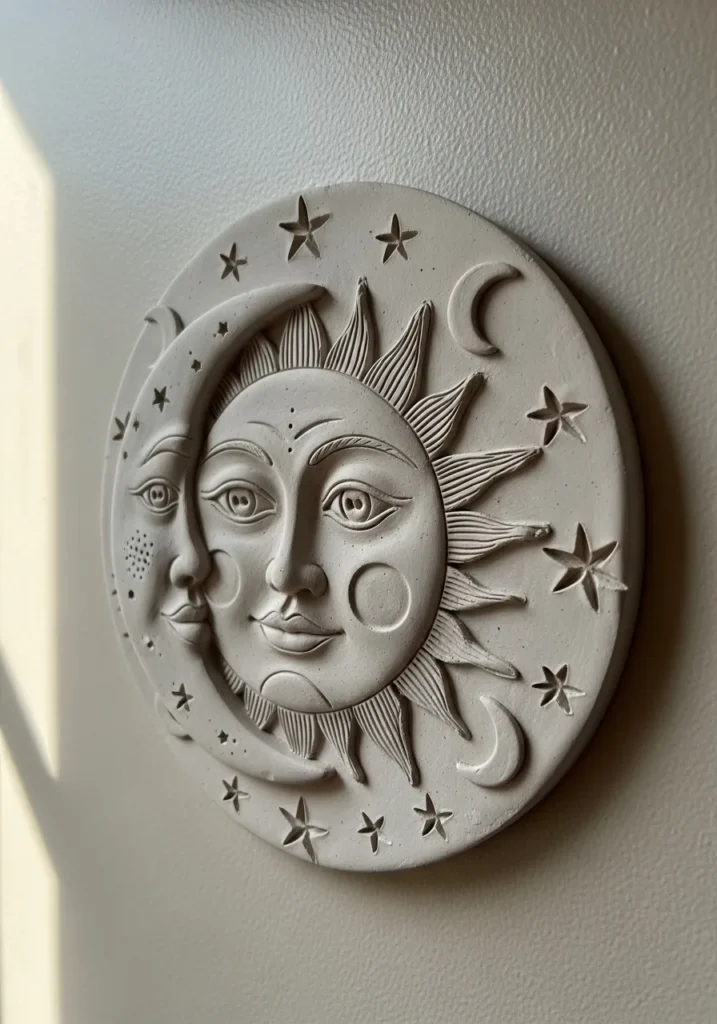 I love projects that let me experiment with texture and small details like this. Pressing in stars and shaping the sun rays feels surprisingly relaxing. It looks intricate, yet the base shape is just a simple circle. That makes it approachable even if you are newer to clay. It adds such a mystical vibe to a room without being over the top.