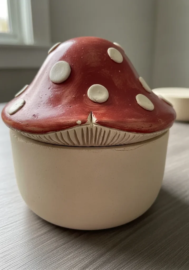 This charming mushroom shaped jar has a rounded base with a removable lid designed like a red mushroom cap. The cap features raised white dots and soft curved edges that make it feel playful and cozy. The base is smooth and neutral, creating a sweet contrast with the textured top. It looks sturdy enough to store small trinkets while still feeling decorative.