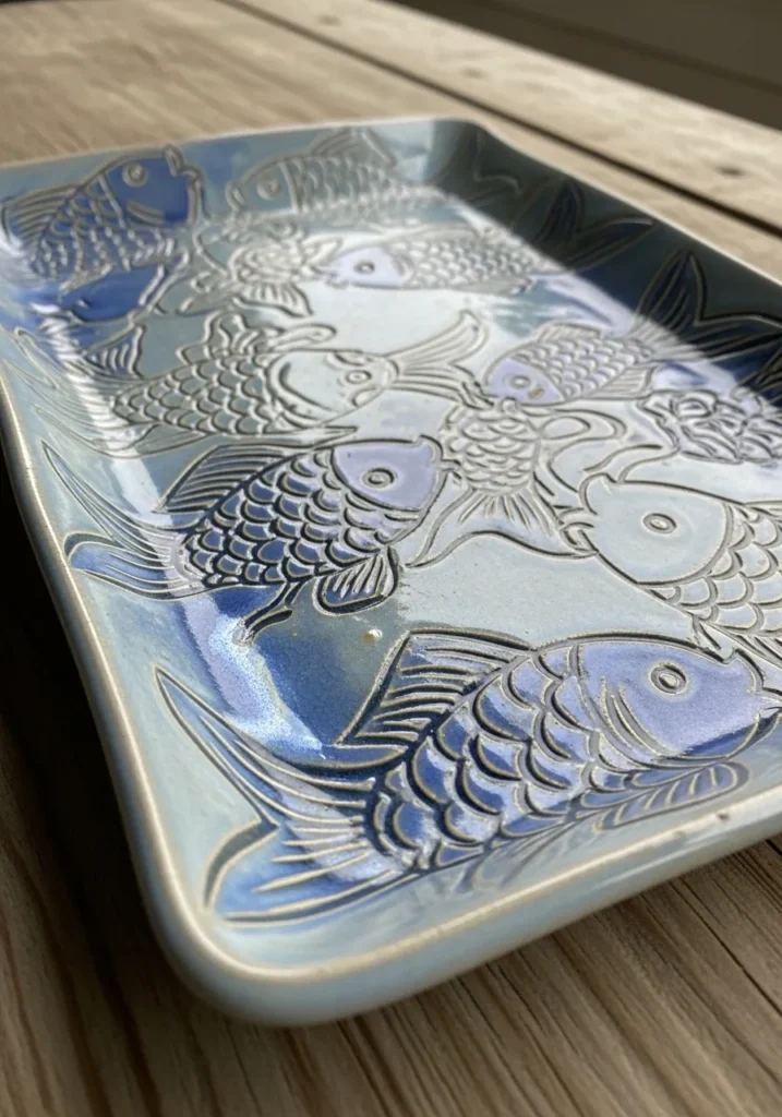 This pottery serving tray features a beautiful carved design of swimming koi fish spread across the surface, creating a sense of gentle movement. The glaze blends soft blue tones with hints of pale gray, giving it a calm water inspired look. The etched details of the fish scales and fins add texture and depth, while slight glaze variations and tiny imperfections enhance its handmade charm. The rectangular shape with softly raised edges makes it both practical and visually striking.