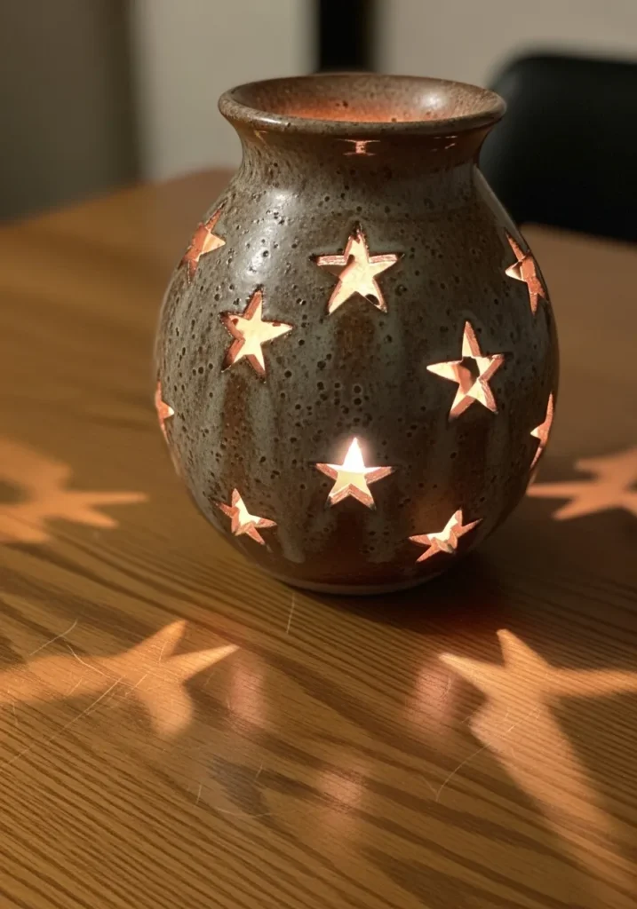 This pottery lantern has a rounded shape with a slightly flared rim and is decorated with star shaped cutouts scattered across the surface. The warm brown glaze has a speckled texture that adds depth, while the openings allow soft light to shine through and cast beautiful star patterns onto the surrounding surface. Subtle glaze variations and tiny imperfections give it that cozy handmade feel.