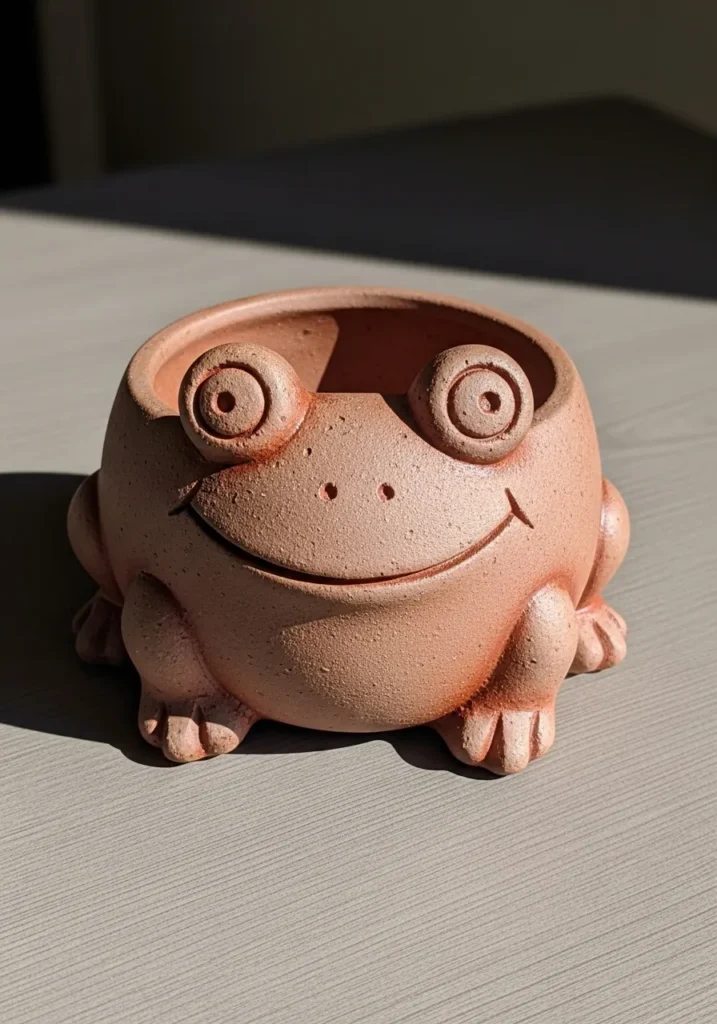 This charming pottery planter is shaped like a happy little frog, with rounded eyes, a wide smile, and tiny sculpted feet that give it so much personality. The clay has a warm terracotta tone with a soft matte finish, showing off natural speckles and subtle texture variations. The opening sits neatly at the top, making it perfect for holding small plants, while the slightly uneven surface adds to its handmade feel.