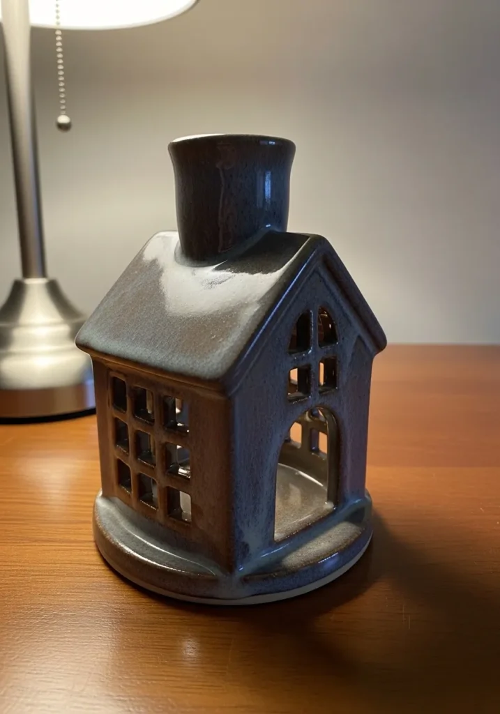 This pottery piece is shaped like a tiny cozy house, complete with cut out windows, an arched doorway, and a small chimney on top. The glaze blends deep brown tones with soft gray accents, creating a slightly weathered look that adds charm. The surface shows gentle texture and natural imperfections, while the openings allow light to glow through beautifully when a candle is placed inside.