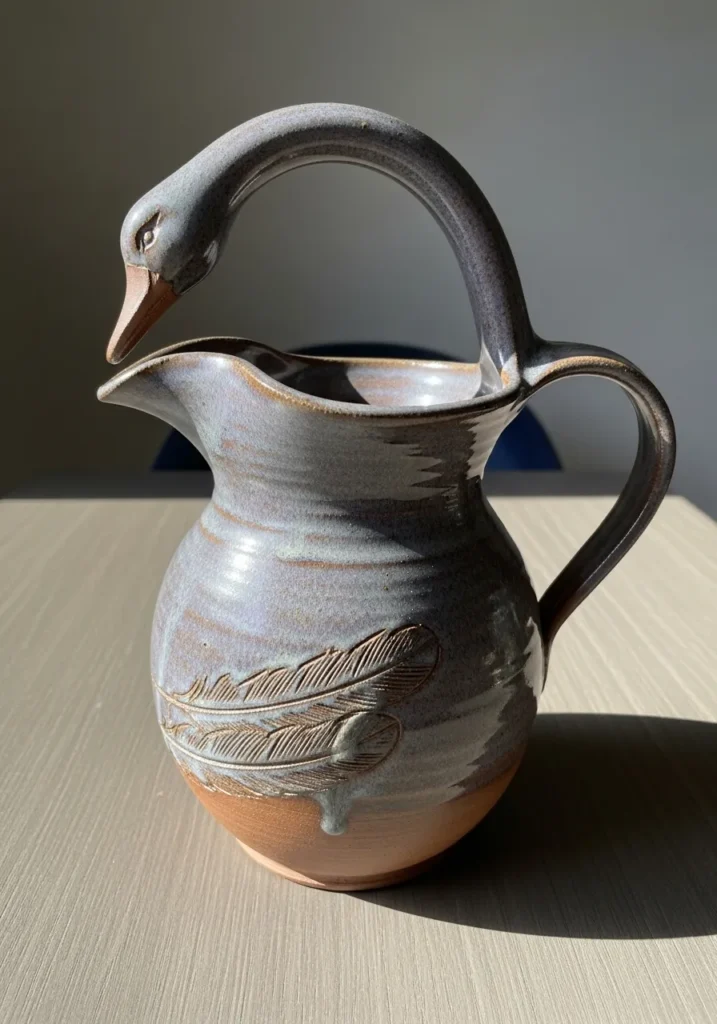 This pottery pitcher has a beautifully sculpted swan shaped handle that curves gracefully over the top, creating both a functional grip and a striking design feature. The body is rounded with a softly flared spout, finished in a layered glaze of smoky gray and warm earthy tones. A delicate feather carving wraps around the lower portion, adding texture and a subtle nature inspired detail, while slight glaze variations and speckles give it that authentic handmade feel.