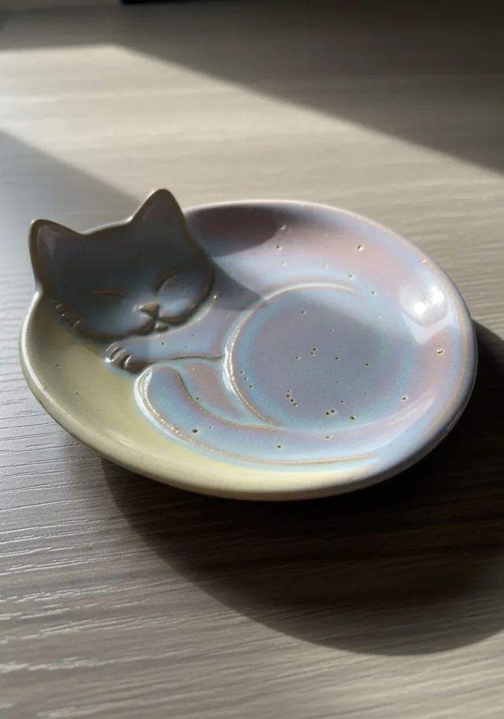This charming clay trinket dish is shaped like a curled up sleeping cat, with its tiny paws tucked in and eyes gently closed. The soft pastel glaze gives it a dreamy, almost iridescent finish, with subtle speckles and natural glaze imperfections adding to its handmade feel. The shallow dish curves around the cat’s body, creating a perfect little space for rings, earrings, or small keepsakes. The smooth surface contrasts beautifully with the delicate sculpted details of the cat’s face and ears, making it both functional and decorative.