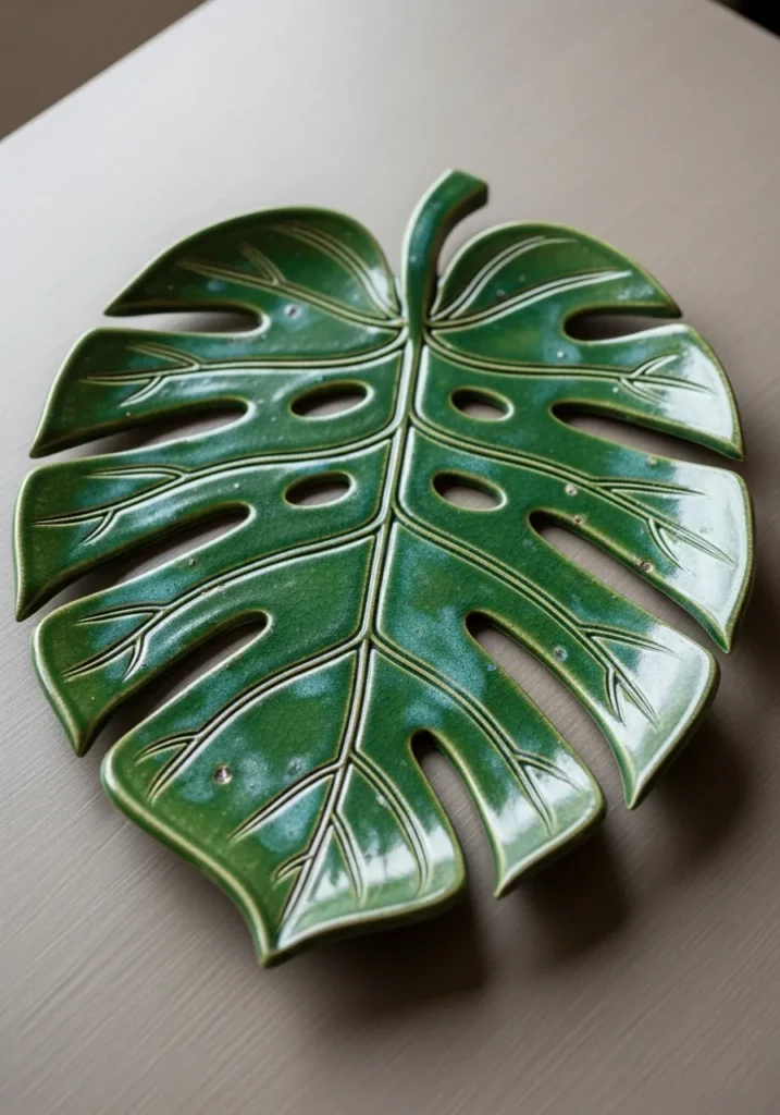This ceramic platter is shaped like a large monstera leaf, complete with carved split details and natural vein textures. The glossy green glaze shifts between deep forest tones and lighter highlights along the raised areas. The edges are slightly curved, giving it the feel of a real leaf resting on the table. The organic shape makes it stand out from traditional round or square dishes.